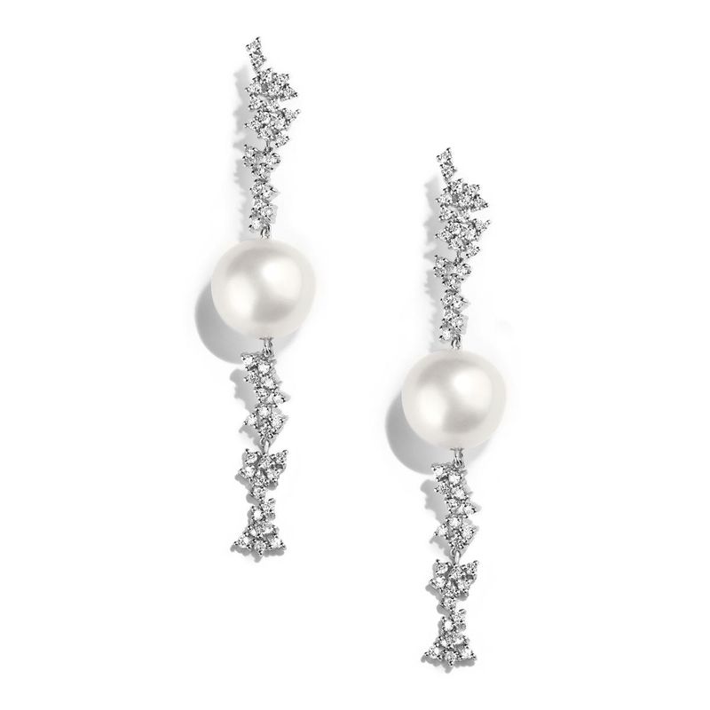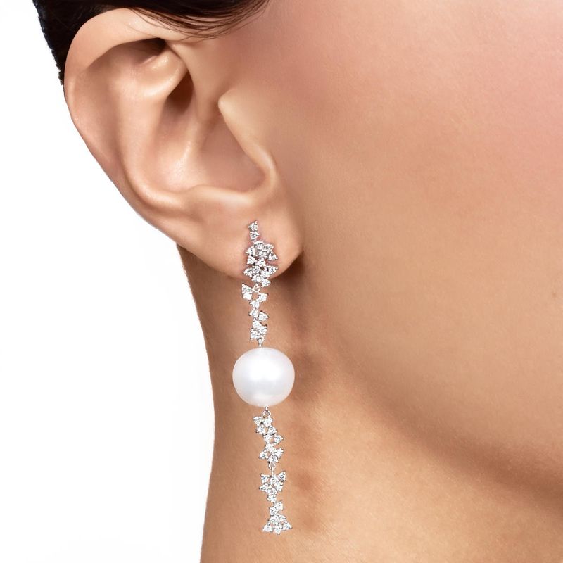 Brinco em ouro branco com pérolas e diamantes. ESPECIFICAÇÕES TÉCNICAS Joia em ouro 18k Acabamento: polido Pedra: 2 pérolas com aproximadamente 12 mm e 96 diamantes com total de 1,25 quilates