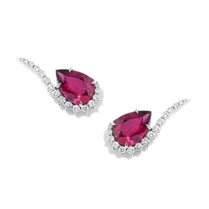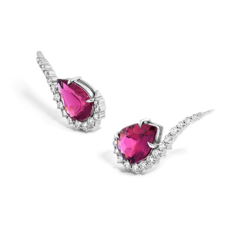 Brinco em ouro branco, turmalinas rosa e diamantes.