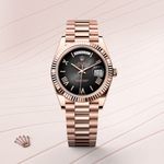 A versão em ouro Everose 18 quilates vem equipada com um mostrador ardósia ombré, uma tonalidade inédita. O mostrador revela ainda uma superfície colorida no centro, passando para o preto mais denso no contorno. Outra novidade no mostrador ombré do relógio são os algarismos romanos independentes facetados, bem como indicadores das horas igualmente facetados em ouro rosa 18 quilates. Até agora, os mostradores ombré da Rolex eram cravejados de diamantes em lugar dos indicadores, e eram reservados para o Day-Date 36. Esse novo mostrador é a continuação de um design apresentado pela marca nos anos 1980, depois relançado em 2019. A fabricação desses mostradores em degradê concêntrico requer a aplicação de uma laca preta, operação delicada, feita por um especialista, controlada e, se necessário, ajustada, para que haja uma transição harmoniosa da cor para o escuro.